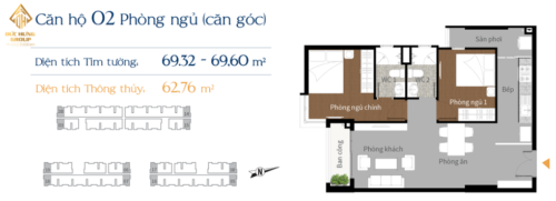 – Căn hộ 2PN – 2WC, có diện tích thông thủy: 62.76m2 – diện tích sàn xây dựng: 69.32m2 – 69.60m2