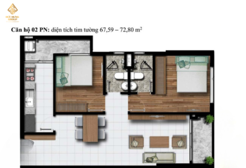 – Căn hộ 02: 2PN – 2WC, có diện tích tim tường: 67.59 – 72.80m2