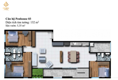 – Căn hộ 03: 3PN – 3WC, có diện tích tim tường: 132m2, sân vườn 3.35m2
