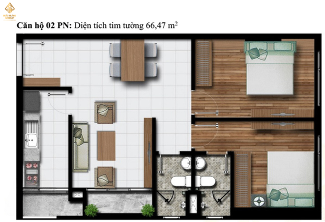 – Căn hộ 01: 2PN – 2WC, có diện tích tim tường: 66.47m2