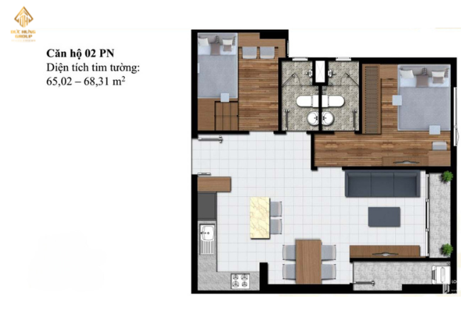 – Căn hộ 02: 2PN – 2WC, có diện tích tim tường: 65.02m2 – 68.31m2