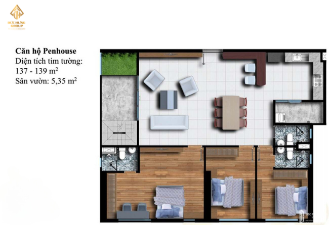 – Căn hộ 03: 3PN – 3WC, có diện tích tim tường: 132m2, sân vườn 3.35m2