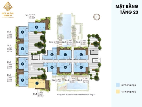 – Căn hộ DL6: 3PN – 2WC, có diện tích lọt lòng: 134.8m2 và diện tích tim tường: 141m2