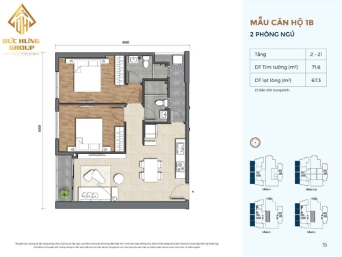 – Căn hộ 2C: 2PN – 2WC, có diện tích lọt lòng: 67.3m2 và diện tích tim tường: 71.6m2