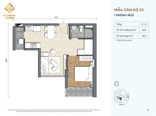 – Căn hộ 1C: 1PN – 1WC, có diện tích lọt lòng: 50.7m2 và diện tích tim tường: 54.1m2