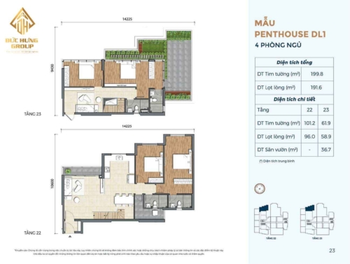 – Căn hộ DL1: 4PN – 1WC, có diện tích lọt lòng: 191.6m2 và diện tích tim tường: 199.8m2