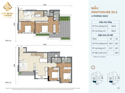 – Căn hộ DL3: 4PN – 1WC, có diện tích lọt lòng: 182.6m2 và diện tích tim tường: 190.6m2