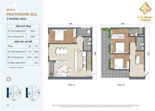 – Căn hộ DL2: 3PN – 2WC, có diện tích lọt lòng: 135.2m2 và diện tích tim tường: 142.3m2