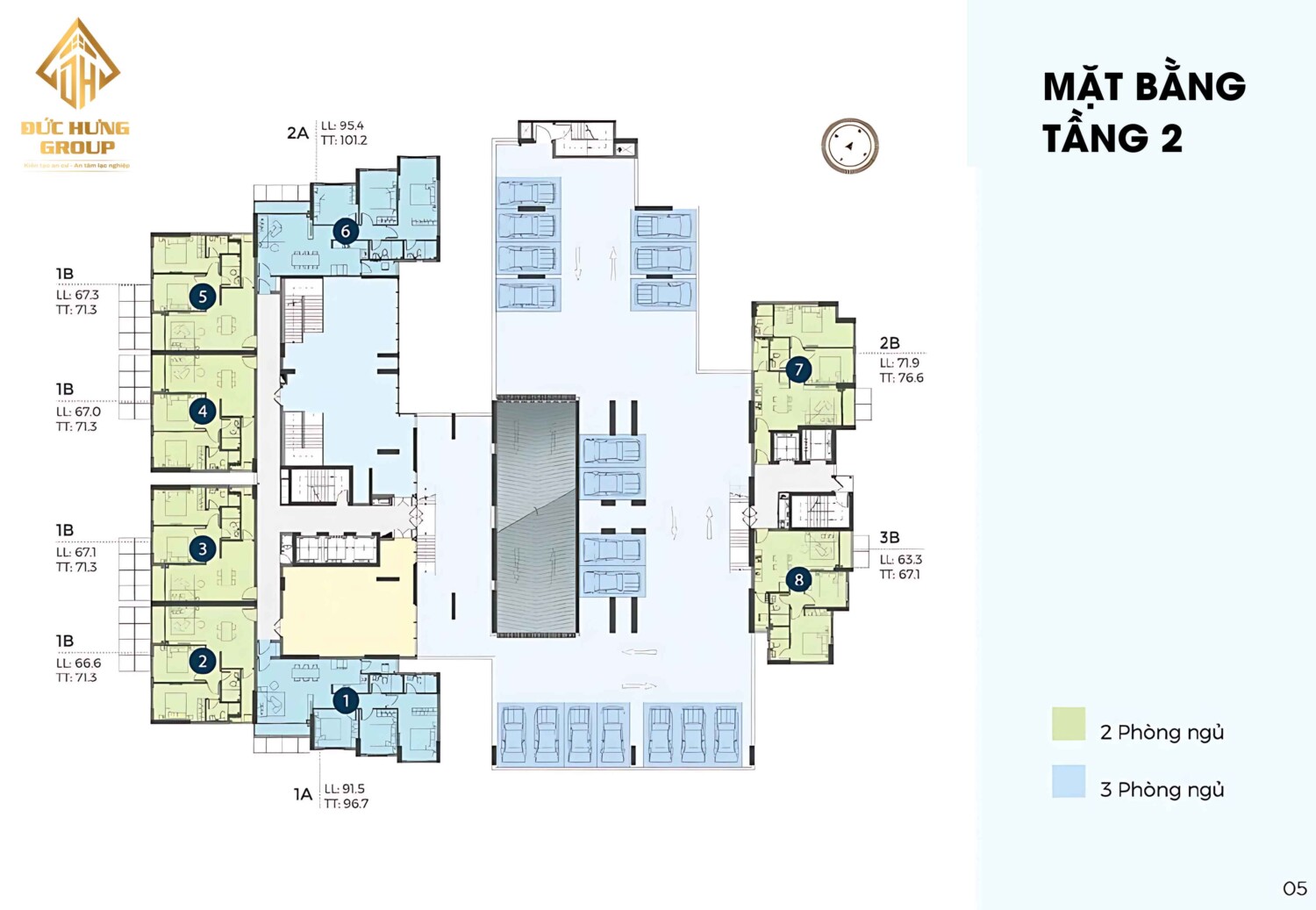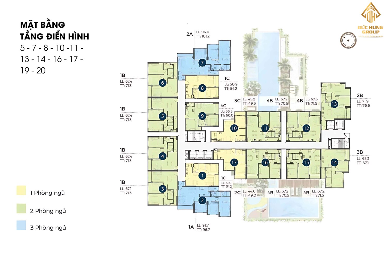 – Căn hộ 1B: 2PN – 2WC, có diện tích lọt lòng: 67.3m2 và diện tích tim tường: 71.6m2
