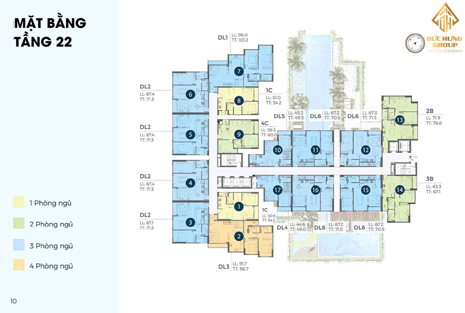 – Căn hộ DL1: 4PN – 1WC, có diện tích lọt lòng: 191.6m2 và diện tích tim tường: 199.8m2
