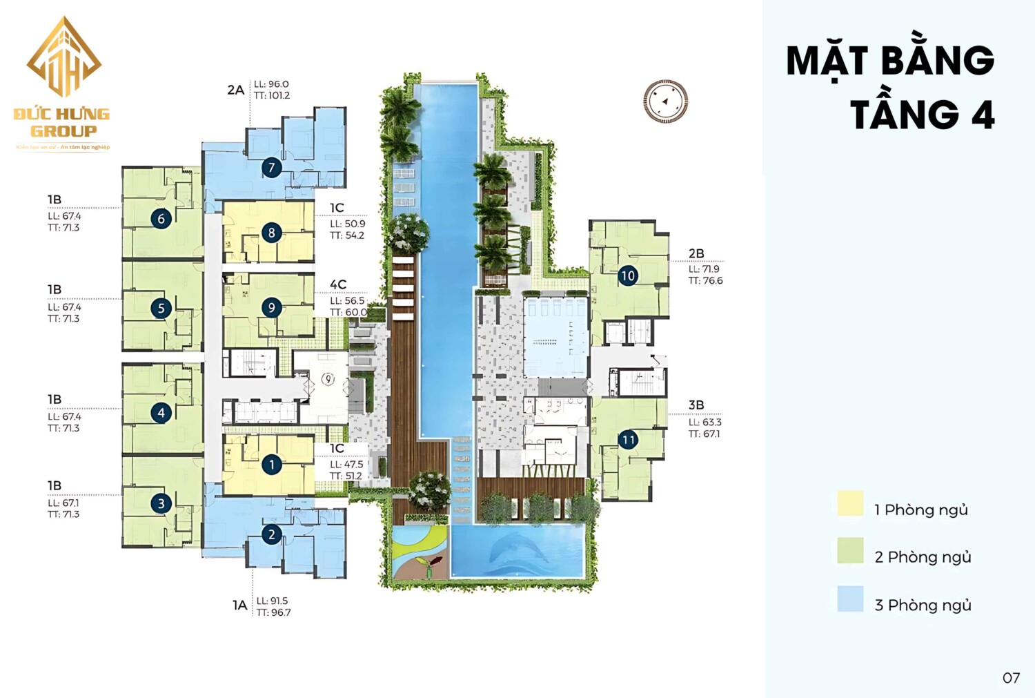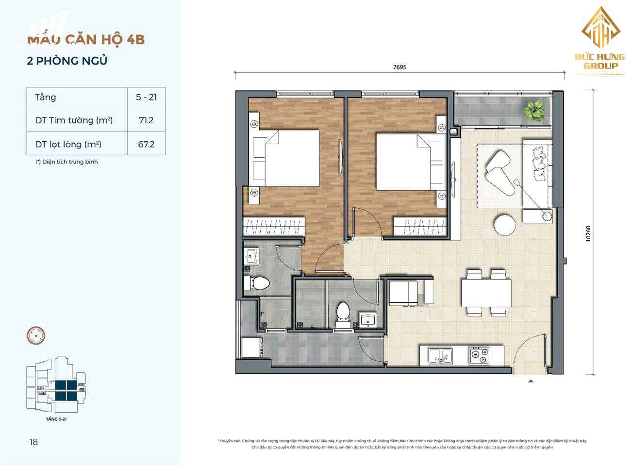 – Căn hộ 4B: 2PN – 2WC, có diện tích lọt lòng: 67.2m2 và diện tích tim tường: 71.2m2