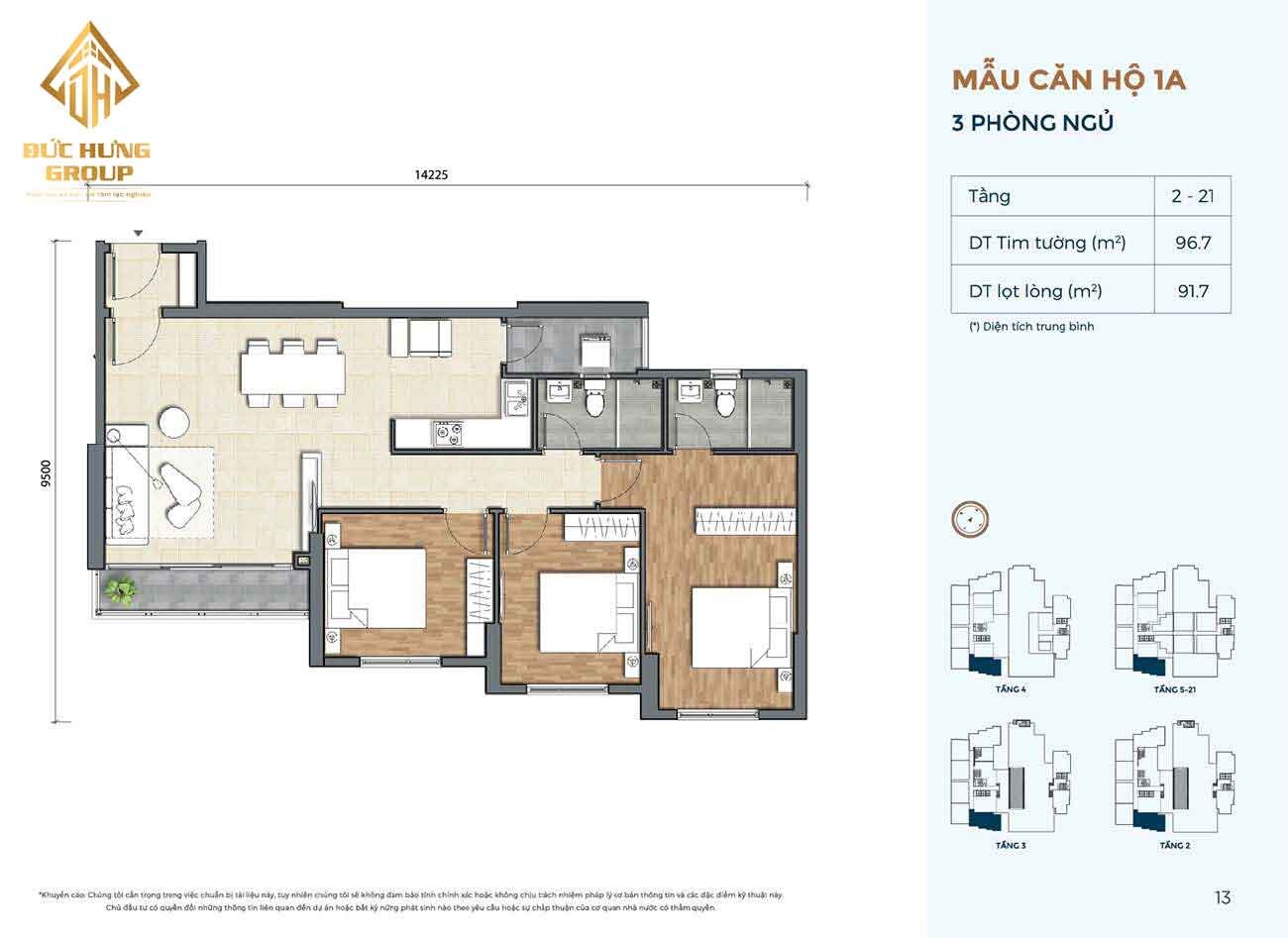 – Căn hộ 1A: 3PN – 2WC, có diện tích lọt lòng: 91.7m2 và diện tích tim tường: 96.7m2