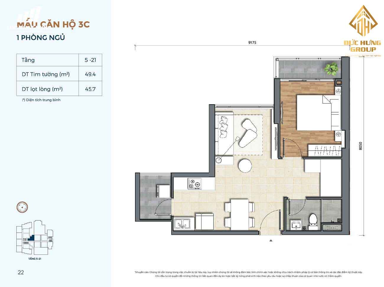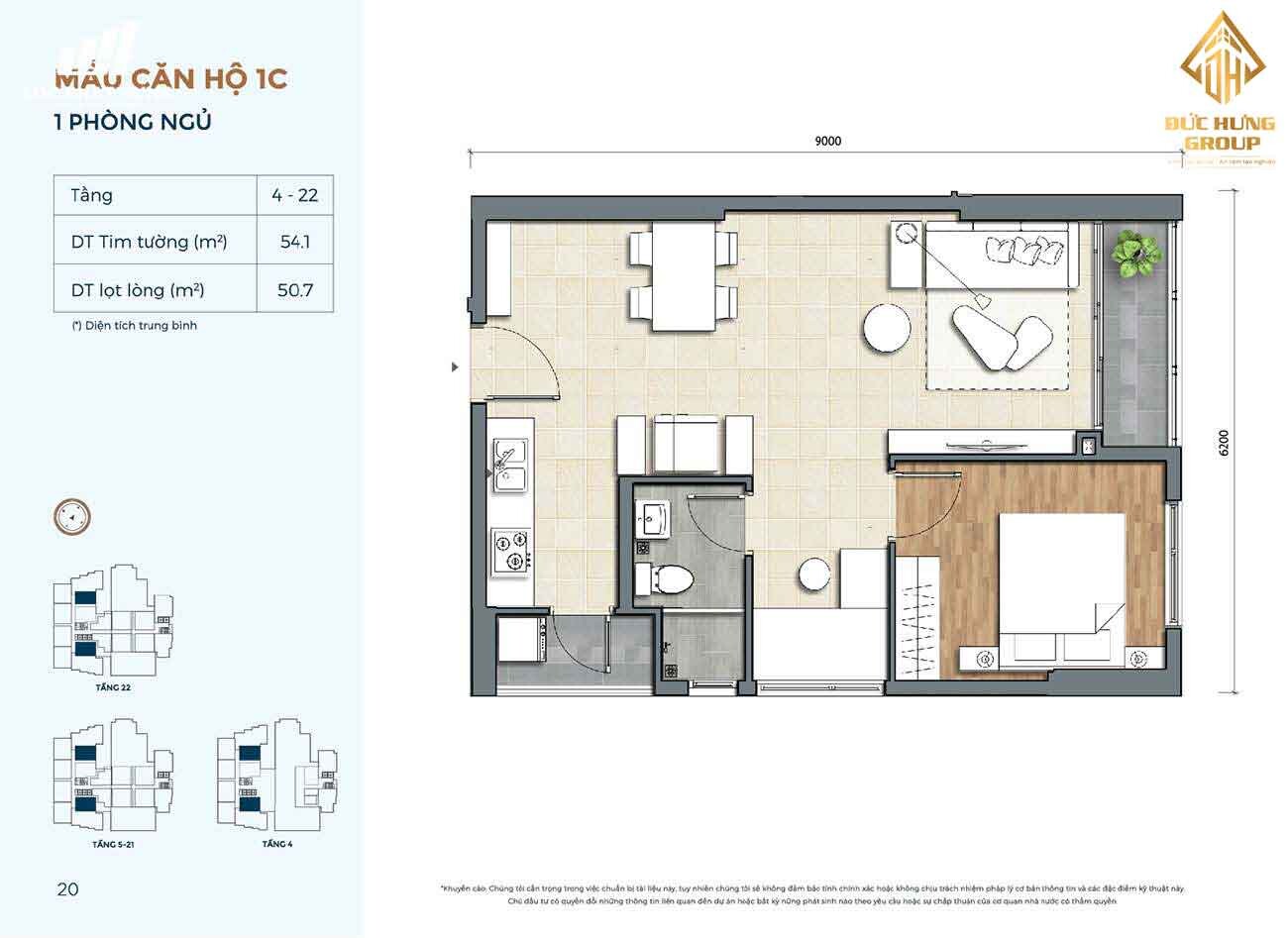 – Căn hộ 1C: 1PN – 1WC, có diện tích lọt lòng: 50.7m2 và diện tích tim tường: 54.1m2