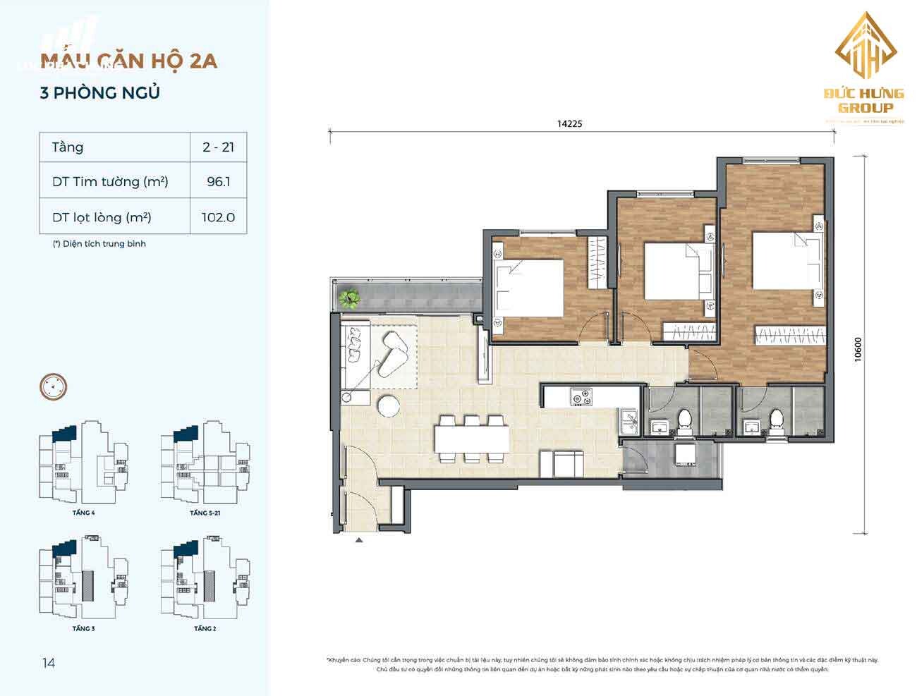 – Căn hộ 2A: 3PN – 2WC, có diện tích lọt lòng: 102m2 và diện tích tim tường: 96.1m2