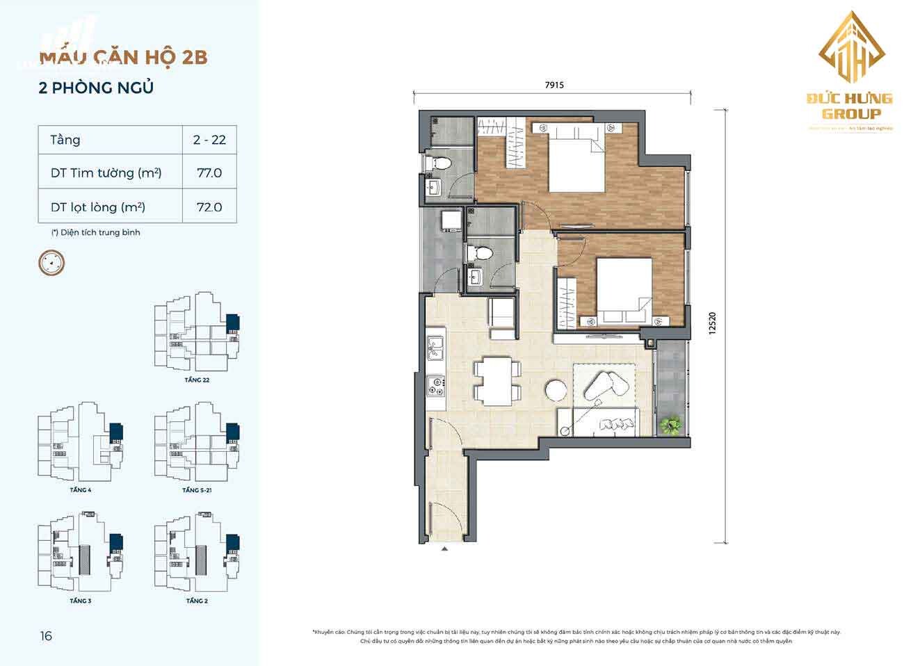 – Căn hộ 2B: 2PN – 2WC, có diện tích lọt lòng: 72m2 và diện tích tim tường: 77m2