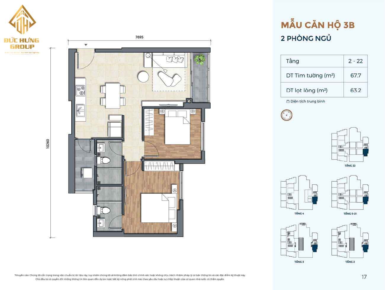 – Căn hộ 3B: 2PN – 2WC, có diện tích lọt lòng: 63.2m2 và diện tích tim tường: 67.7m2