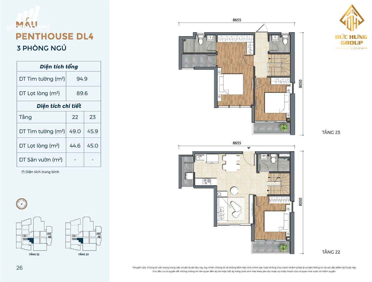 – Căn hộ DL4: 4PN – 1WC, có diện tích lọt lòng: 89.6m2 và diện tích tim tường: 94.9m2