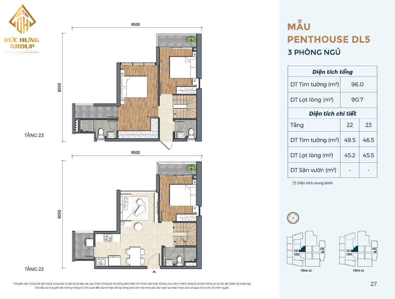 – Căn hộ DL5: 3PN – 2WC, có diện tích lọt lòng: 90.7m2 và diện tích tim tường: 96m2