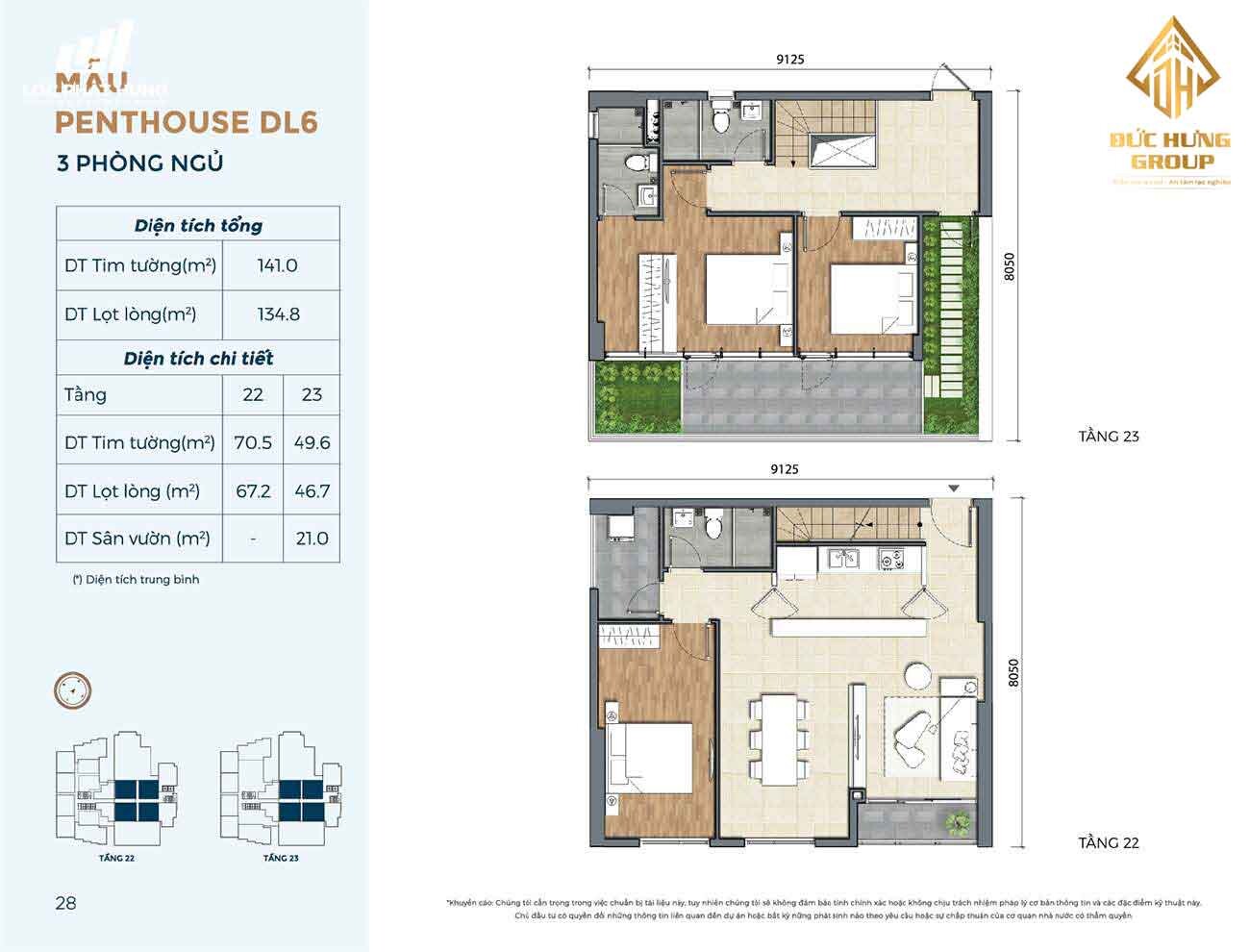 – Căn hộ DL6: 3PN – 2WC, có diện tích lọt lòng: 134.8m2 và diện tích tim tường: 141m2