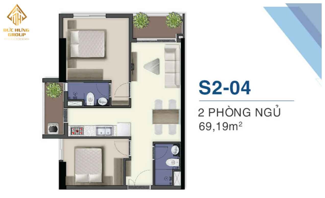 – Căn hộ S2-04: 2PN – 2WC, có diện tích: 69.19m2