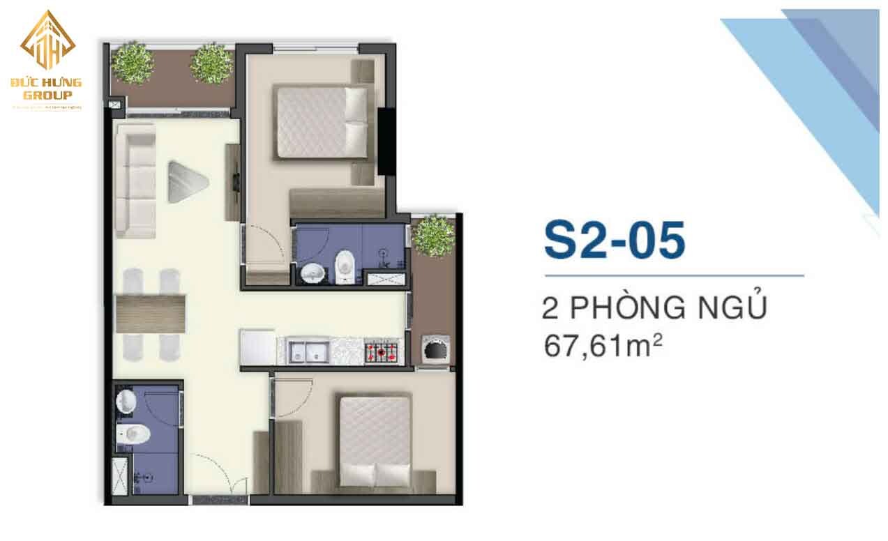– Căn hộ S2-05: 2PN – 2WC, có diện tích: 67.61m2