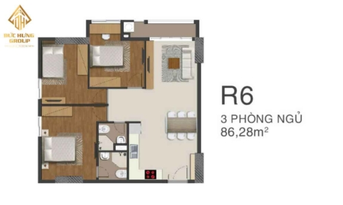– Căn hộ R6: 3PN – 2WC, có diện tích: 86.28m2