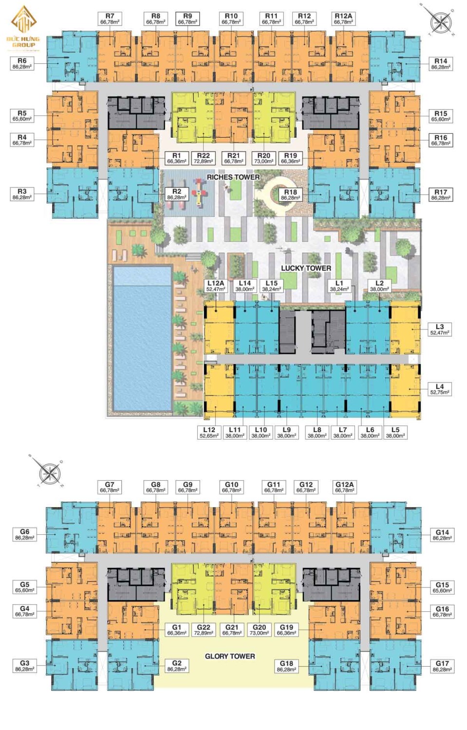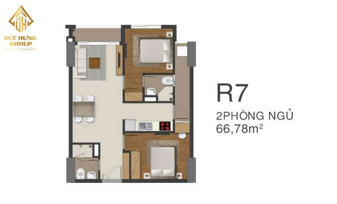 – Căn hộ R7: 2PN – 2WC, có diện tích: 66.78m2