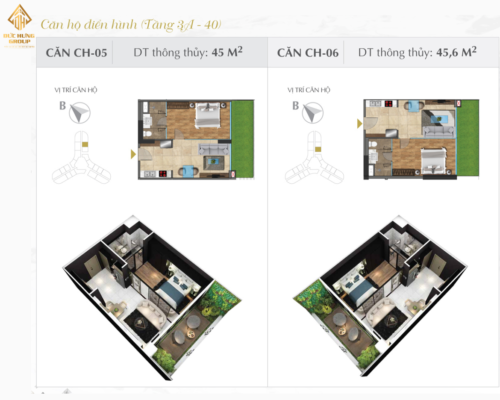 – Căn hộ 06: 1PN – 1WC, có diện tích thông thủy: 45.6m2