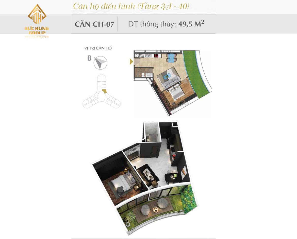 – Căn hộ 07: 1PN – 1WC, có diện tích thông thủy: 49.5m2