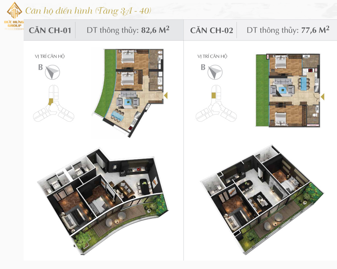 – Căn hộ 02: 2PN – 2WC, có diện tích thông thủy: 77.6m2