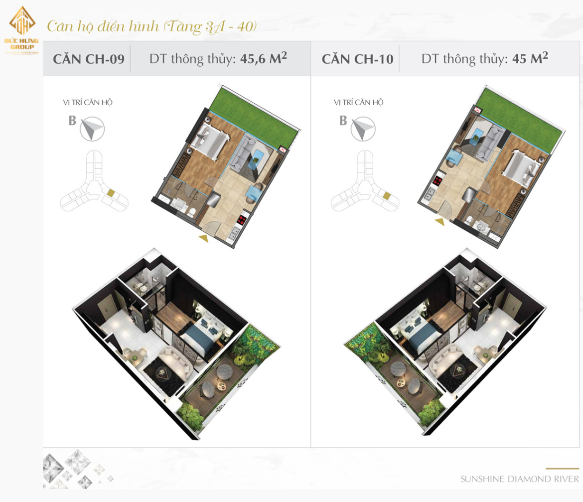 – Căn hộ 09: 1PN – 1WC, có diện tích thông thủy: 45.6m2