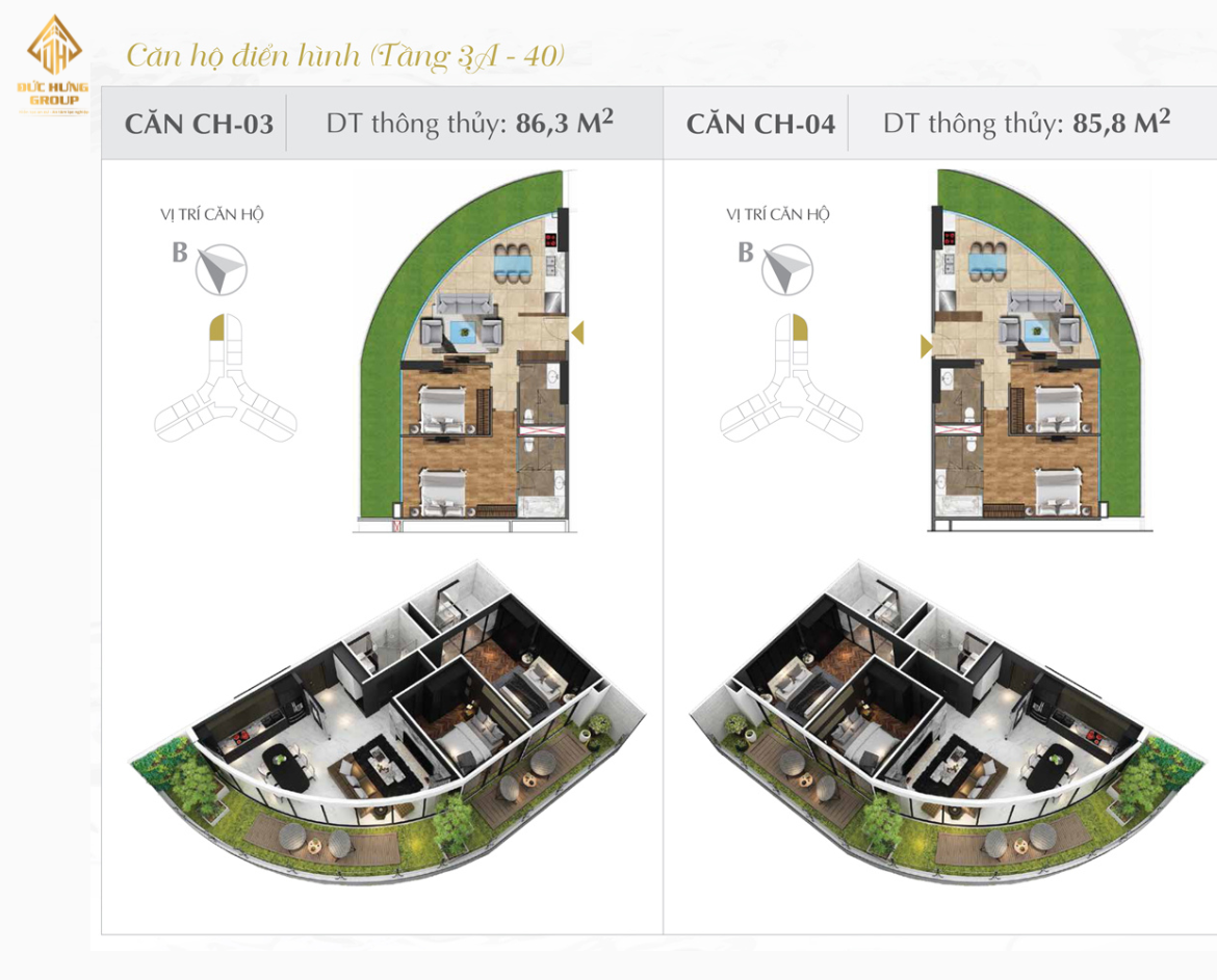 – Căn hộ 04: 2PN – 2WC, có diện tích thông thủy: 85.8m2